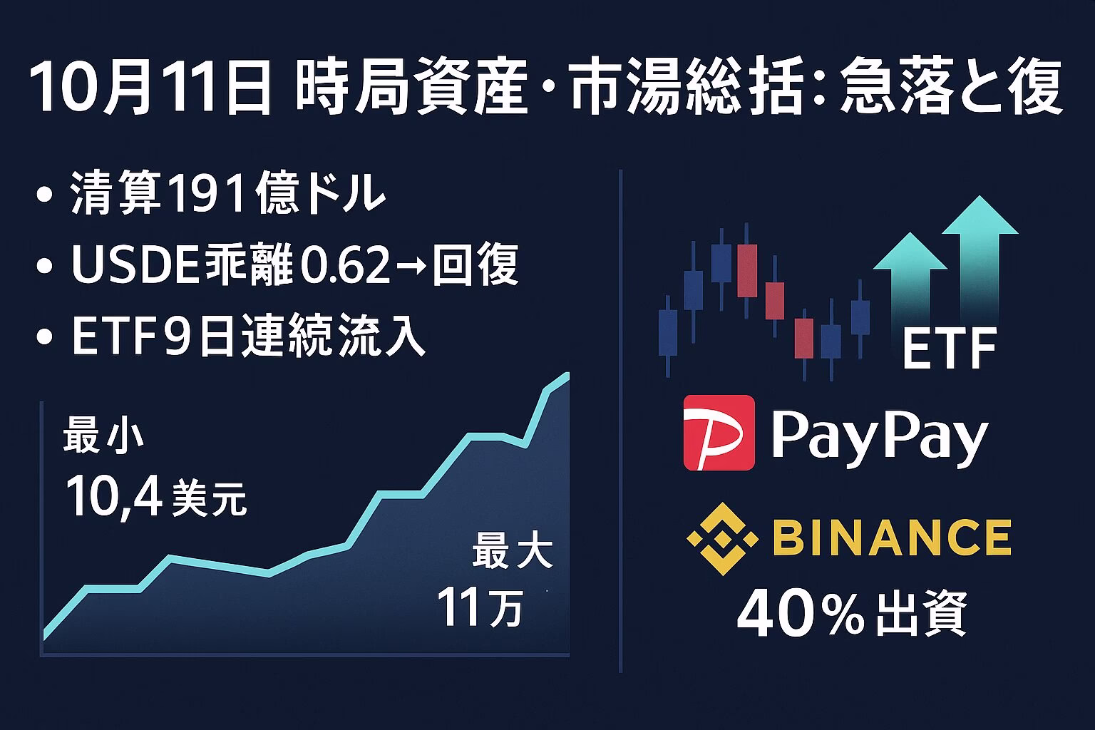 突発の急落はなぜ起き、どこまで戻ったのか――本稿は10月11日 暗号資産ニュースの要点を、価格・清算・ステーブル・機関投資家・国内動向の5本柱で解説する。結論は、外部ショックと過剰レバの清算連鎖で急落したが、流動性の戻りとETF資金の下支えで一定の修復が進んだ。読むメリットは、短期のリスク管理と中期シナリオを同時に持てる点だ。