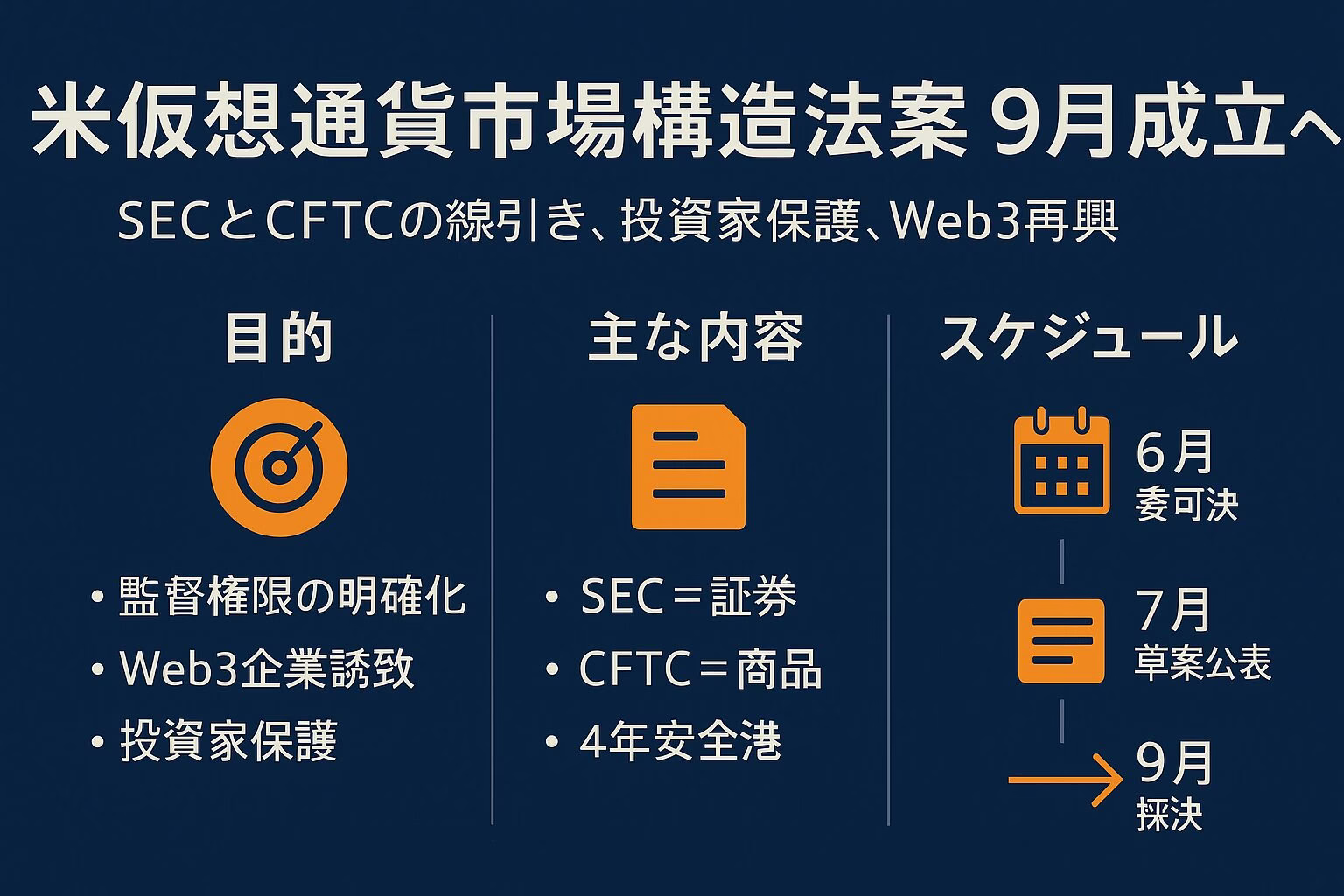米国は2025年9月末までに「仮想通貨市場構造法案」を成立させ、市場のルールを明確化しようとしています。