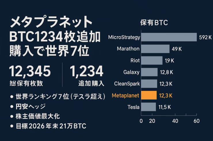 メタプラネット ビットコイン追加購入は、なぜ投資家の耳目を集めるのか。──それは同社が国内上場企業として初めて、ビットコインを企業価値向上の中核に据えたからだ。テスラを抜いて世界7位に躍り出た今回の買い増しは、円安ヘッジと株主価値最大化を狙う“日本版マイクロストラテジー”戦略の表れである。この記事では追加購入の詳細、他社比較、市場の反応を整理し、読者が次の投資判断に活かせる情報を提供する。