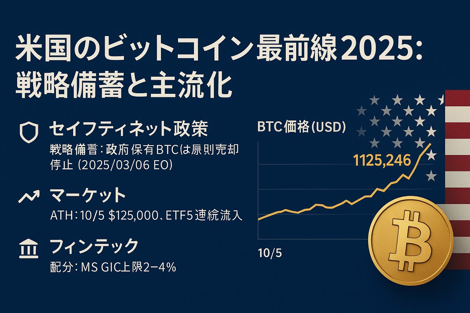 米国では「米国 ビットコイン 戦略備蓄」を含む政策転換が進み、金融機関の受容と価格の主流化が並行して進展している。政府は政府保有BTCの売却停止を明文化し、金融は助言配分の明確化、個人は保有者層の拡大が目立つ。断片的なニュースを制度・市場・行動の三層で整理し、意思決定に必要な全体像を300字以内で把握できるよう解説する。