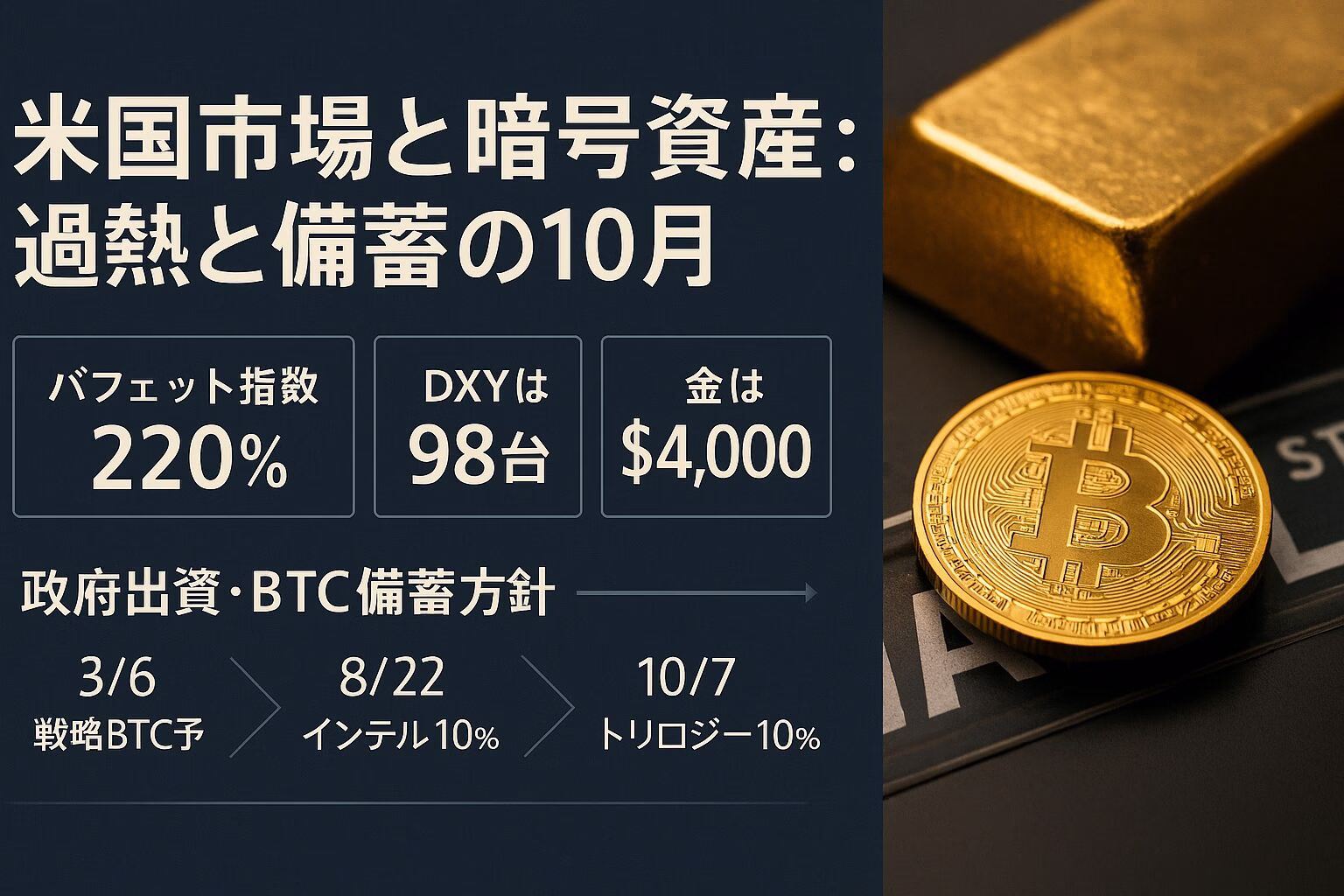 株式は史上高圏だが、ドル安・インフレ再燃懸念の下で金とビットコインに資金が逃避し、政策面では政府の出資と「売らない」戦略備蓄が進む。米国市場 暗号資産 2025年10月の要点を、数値と日付で整理し投資家の判断材料を解説する。